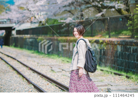 櫻花盛開 女性旅行 沿著蹴上斜坡行走的女性