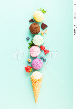 Big colorful set different tastes natural dessert ice cream of consisting various ingredients