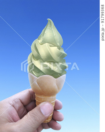 Soft Serve Ice Cream Cone Held in Front of Ocean