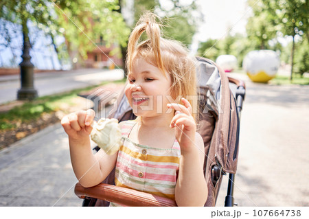 A hungry child enjoys eating ice cream outdoors. Portrait of a cute baby licking a creamy ice cream while walking in a city park, outdoor activities.