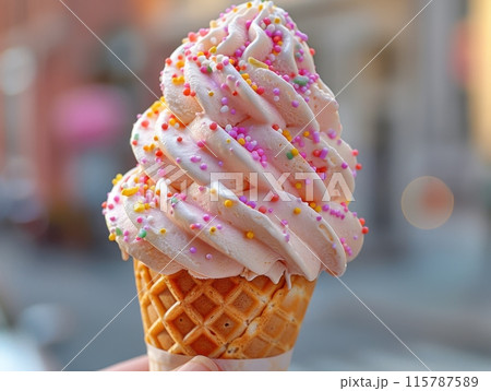 Colorful Sprinkles on Vanilla Ice Cream Cone at Street Fair. National Ice Cream Day