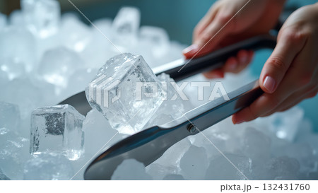 Hands gripping ice tongs lifting a chilled cube amongst frosted ice pieces preparing beverage