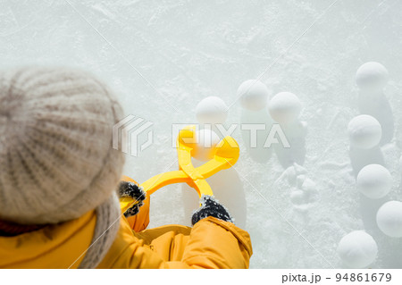 a child in a yellow jumpsuit lays out heart-shaped snowballs on the ice, made with a tool similar to tongs. A tool for modeling snow. making snowballs. Plastic Children's Toy. Winter games in nature