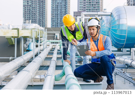 engineer teamwork technician workers service hotel boiler tank hot water supply pipe system. team working safety checking maintenance pipeline heating water delivery line at roof top outdoor.