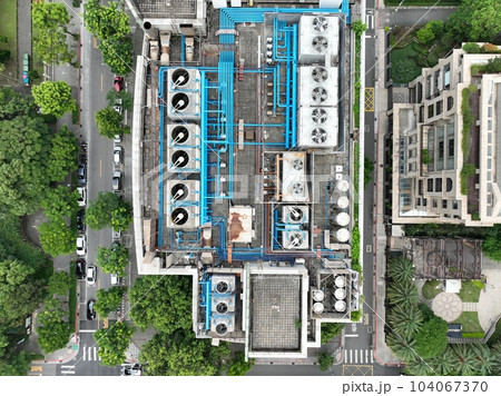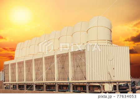 HVAC Air cooling system. heat exchanger water chiller tower for office building air conditioner against hot weather sky background.