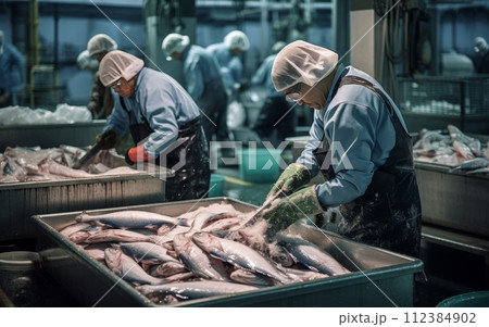 Fishermen are sorting fresh tuna fish in a seafood factory.