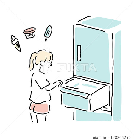 一個女孩從冰箱裡選擇冰淇淋的夏季圖像插圖(日本小學生)