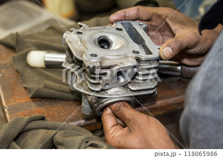 The mechanic man repairing the motorbike engine part.