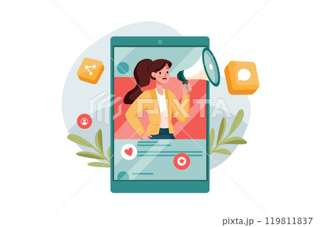 Woman on web screen with megaphone attracts people