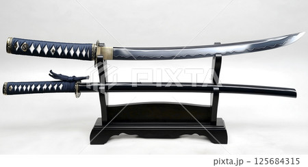 展示的精美日本刀和黑色刀鞘的照片。白色背景