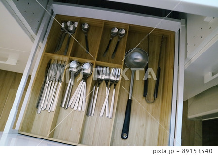 抽屜裡有著各種餐具 叉子刀子湯匙筷子