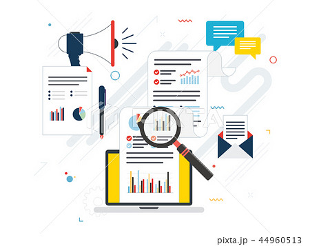 Vector illustration of data analysis concept featuring a magnifying glass over charts and graphs. Ideal for marketing, research, and analytics themes in digital and print media.