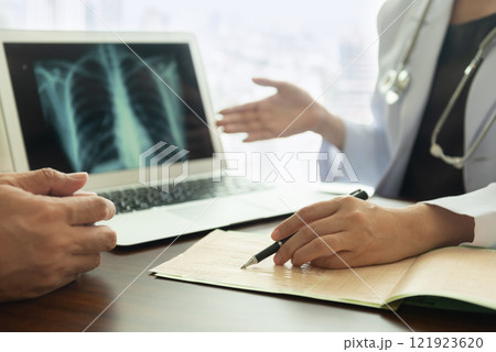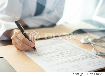 Doctor or nurse in uniform with stethoscope writing something information of patient prescription medical in paperwork