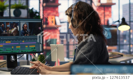 Video creator woman editing a music video on dual monitors in loft studio, multitasking between timeline editing and color grading. Professional editor uses tech tools and software. Camera B.