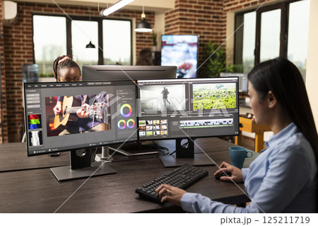 Team of experts editors working in video production industry at agency office, doing color grading and creating a montage on dual monitors. Creative process with multimedia tech tools. Camera A.