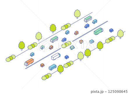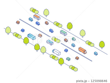 等距道路圖。一條擠滿汽車、卡車和巴士的主要道路。