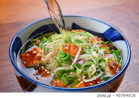 熱鰻魚配大蔥、切碎的紫菜和芥末茶泡