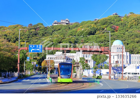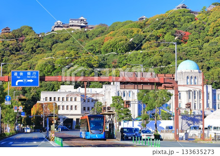 【愛媛郡】晴朗天氣下的松山城、愛媛郡政府和伊予鐵列車