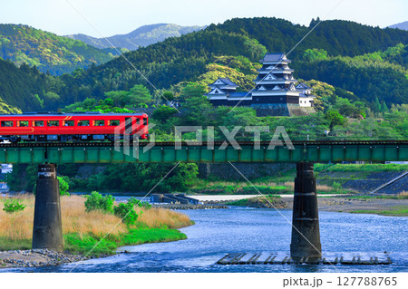 予贊線列車穿過比地川大橋,背景是大洲城