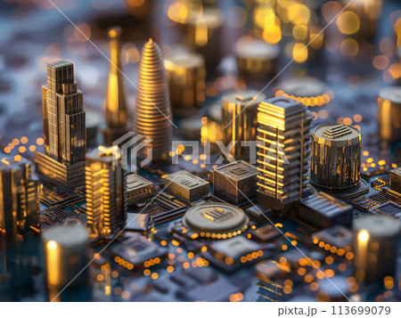 蓝色电路板转盘上建筑未来城市概念矢量背景