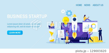 Successful startup launch. Space rocket flies up with graphs charts and diagram on computer screen. Tiny businessmen developing business project with new ideas, vision, growth strategy, innovation