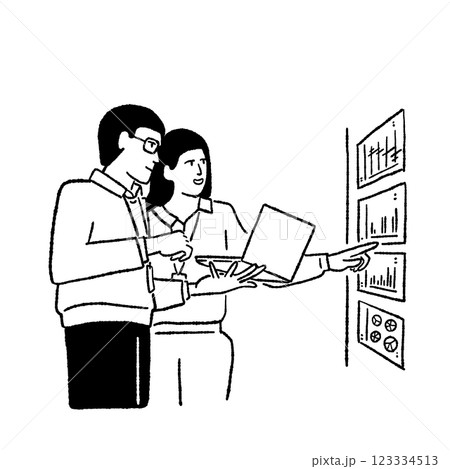 Man and woman discussion on graph Information board People lifestyle Hand drawn Line art Illustration