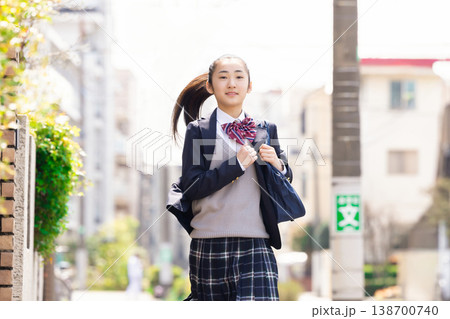 穿著制服的國中生、高中生和女高中生推著自行車走路