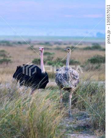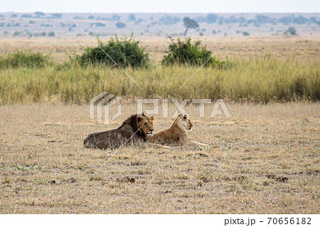 六月,一對獅子在肯尼亞安博塞利國家公園的稀樹草原中sn依