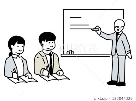 一名男子在白板上解釋,另一名男子在做筆記的插圖