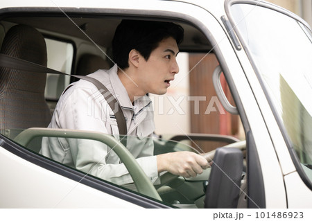 因駕駛卡車而突然剎車而感到驚訝的事故圖像 看著相機