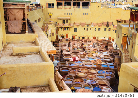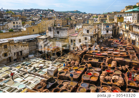Fes, Morocco. Old town panorama,tanneries and tanks with color paint for leather