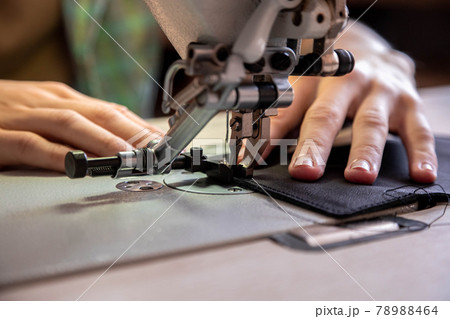 Close up craftsman hands sew stuff blank for wallet use sewing machine. Working at leather workshop