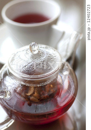 耐熱玻璃茶杯中的玫瑰果茶與白玫瑰