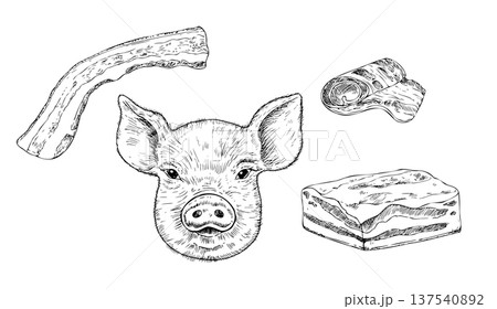 Vector set with pig head, Bacon Strip, lard. Graphic ink Pork belly meat illustration, isolated on background. Hand drawn line sketch. For designers, prints, logo, icon, menu, postcards, holiday