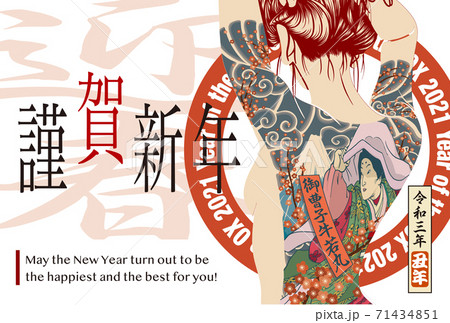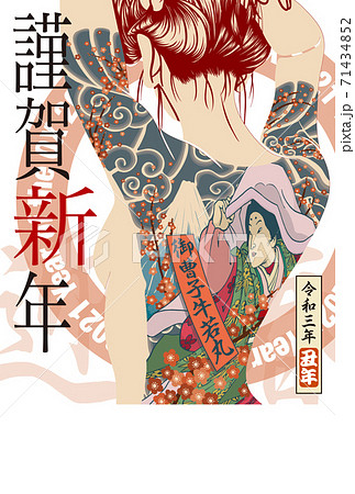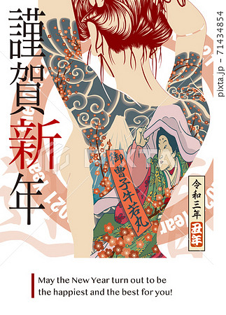 2021年新年賀卡模板“紋身女孩”新年快樂與日本筆記
