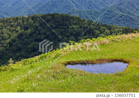 會津駒岳至大津峠之間的沼澤和池塘里,棉草盛開。