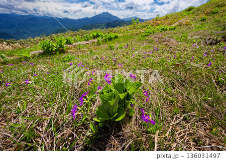 會津駒嶽大津嶺的火打岳和白山小櫻的景色