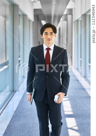 一位穿著西裝的商人拿著智慧型手機走在辦公室走廊上