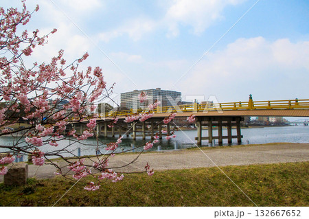 滋賀縣大津市的瀨田唐橋橋和春天的櫻花,瀨田唐橋橋和櫻花,春天的瀨田唐橋橋