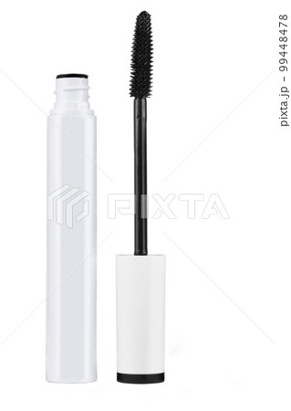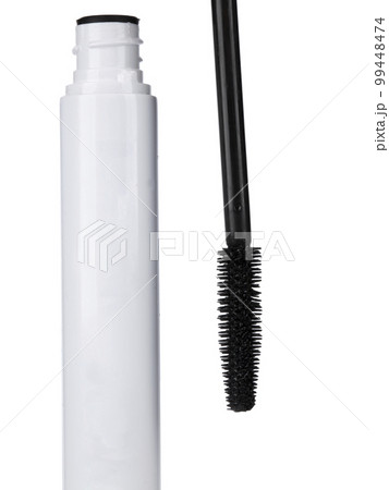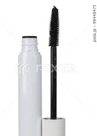 Closeup mascara bottle and brush. Black mascara and tube isolated on white background.