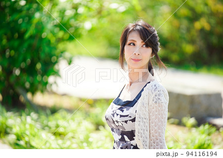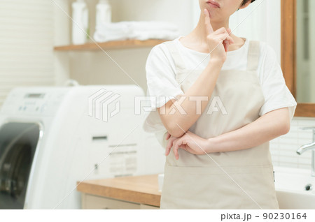 一位穿著圍裙的年輕家庭主婦,帶著洗衣籃做家務