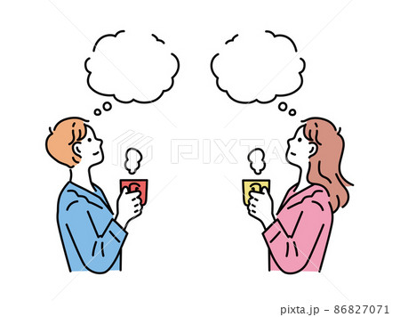 男人和女人喝咖啡的插圖(呼吸、休息、假期、早晨、思考、放鬆、放鬆、回家時間)