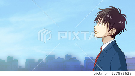 動漫風格的插圖,描繪了一位身穿制服的男學生或工作成年人的側面像,他面朝左側,仰望著城市中的藍天,左側有空間