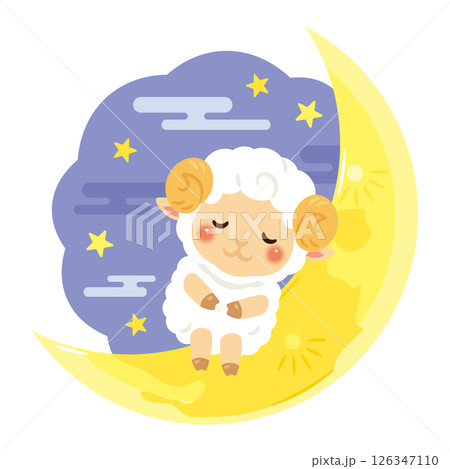 一隻睡著的綿羊和一彎新月的人物插圖