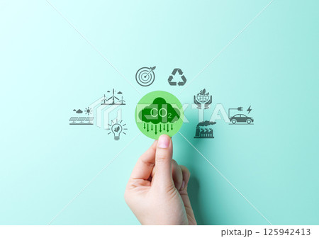 Reducing CO2 Emissions and Promoting Sustainability Concept. A hand holds green CO2 cloud icon with environmental symbols, such as solar, wind turbines, and recycling. Reduce carbon and go green.