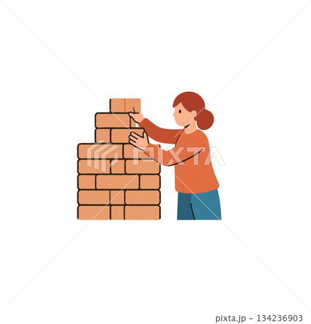 Constructing success: A young woman meticulously builds a brick wall, symbolising creation and