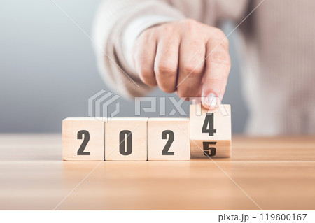 Hand replaces "2024" with "2025" using number blocks, symbolizing the transition into the new year, representing change, progress, and the ongoing passage of time