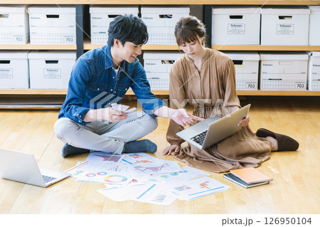 男人和女人坐在辦公室的地板上