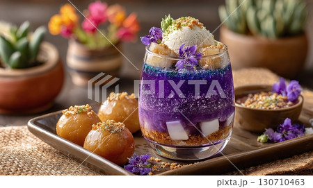A delicious treat featuring a vibrant purple drink topped with ice cream and edible flowers, alongside golden-brown spheres, all beautifully arranged.