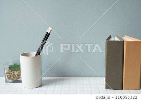 Working desk with notebook, pencil holder, potted plant on white tile desk. gray wall background